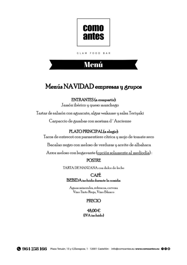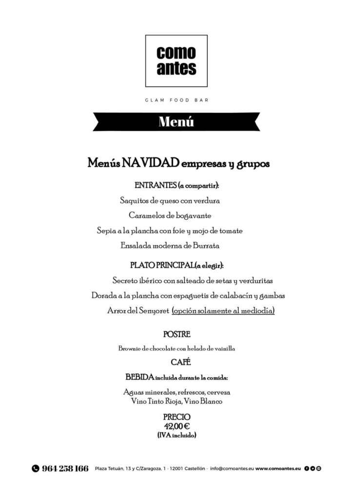 Dos opciones con 2 precios. Una primera por 42€, con 4 entrantes para compartir y tres platos principales para elegir con la opción del arroz como plato principal para celebraciones a mediodía, una segunda, con 3 entrantes para compartir y 3 platos principales entre los que elegir uno donde elegir entre arroz (solo mediodía), carne o pescado..